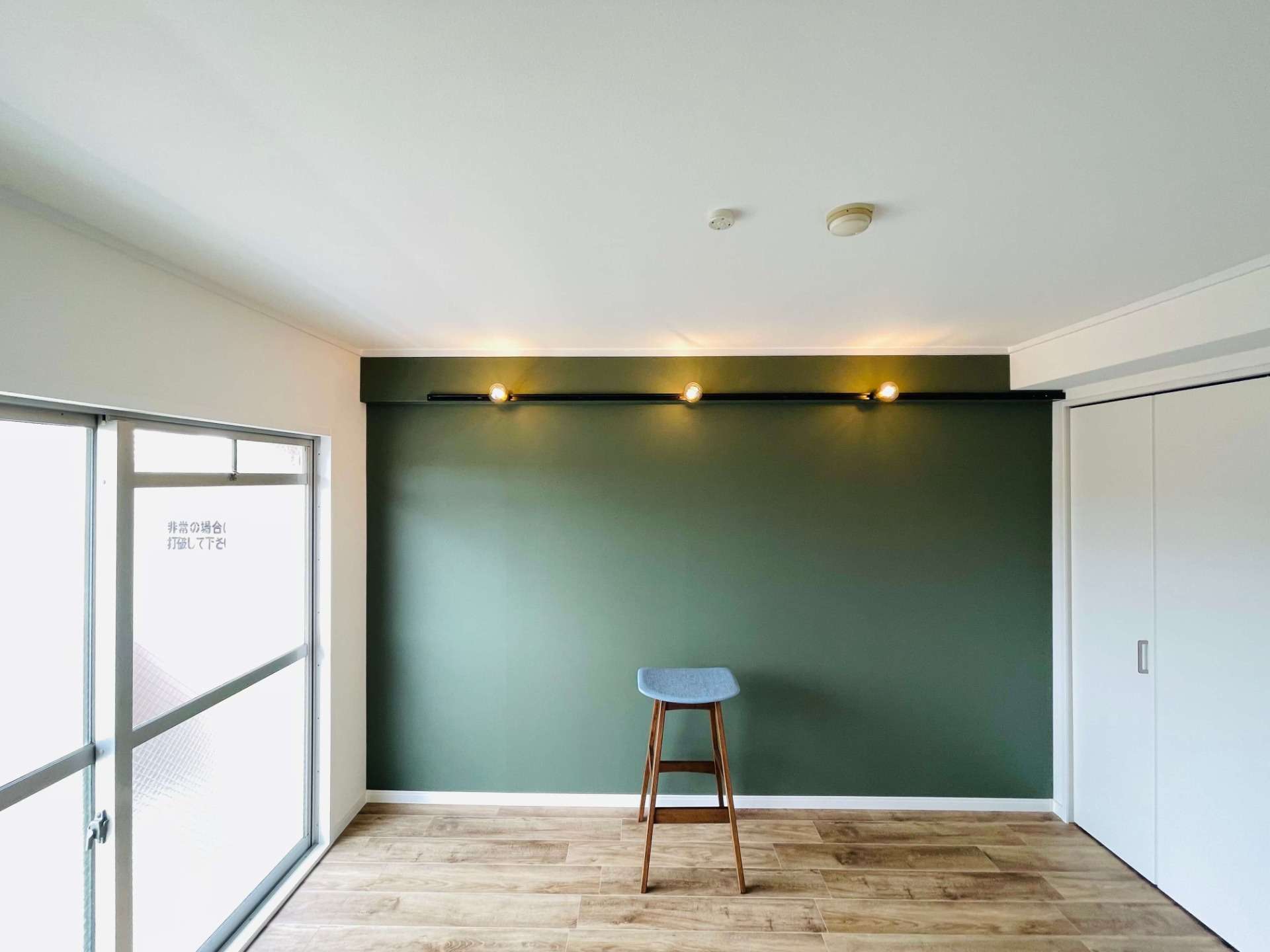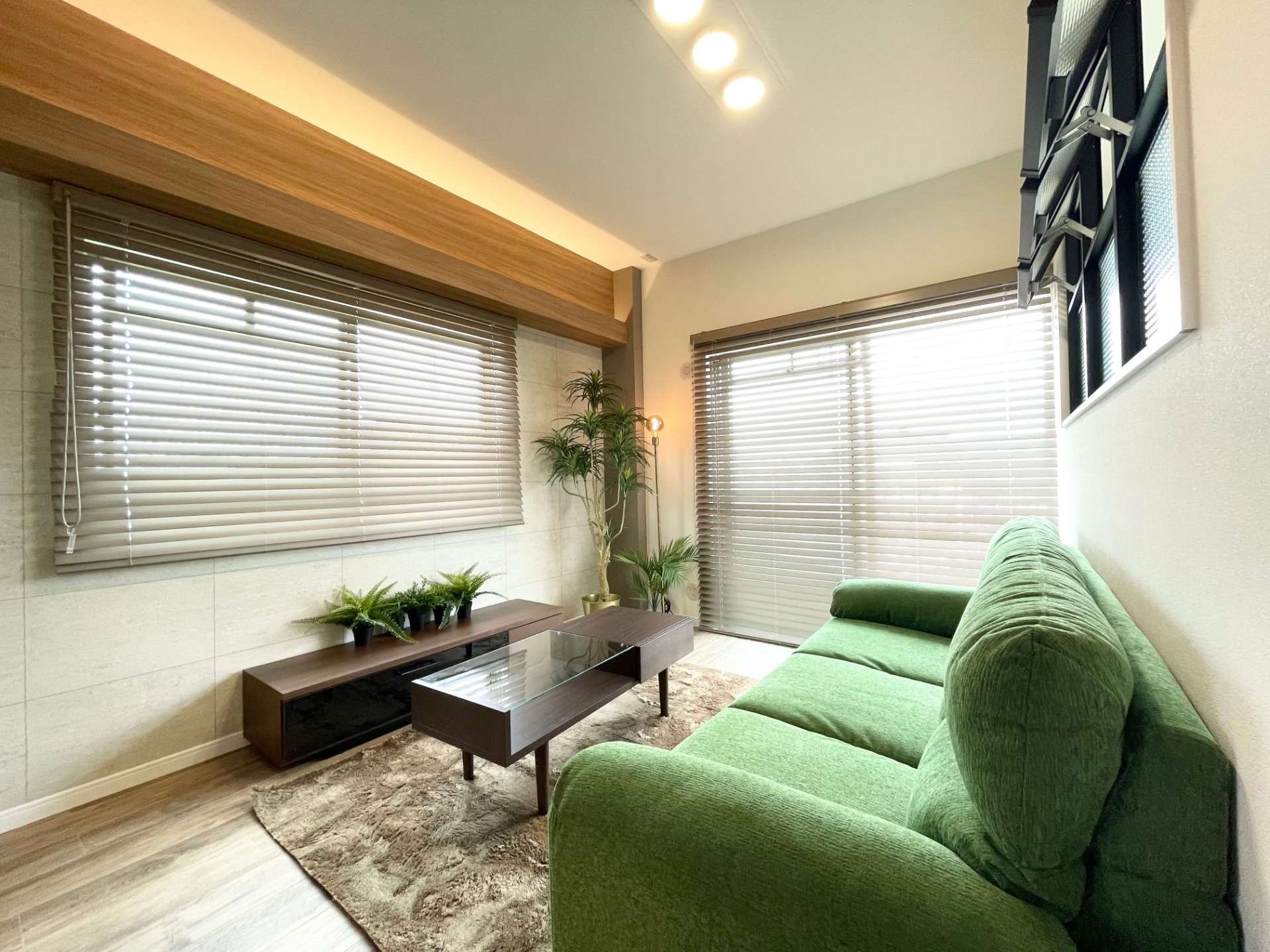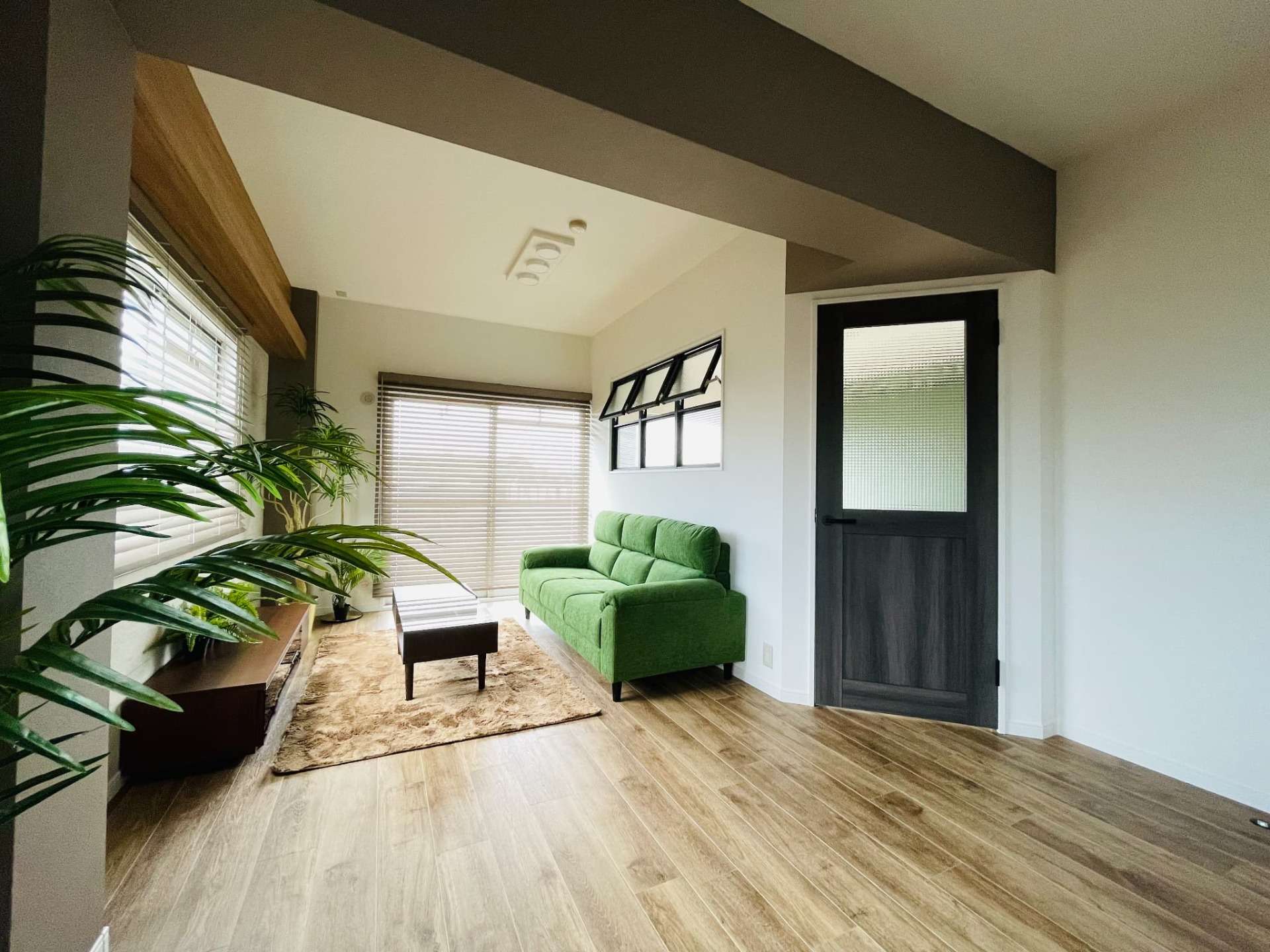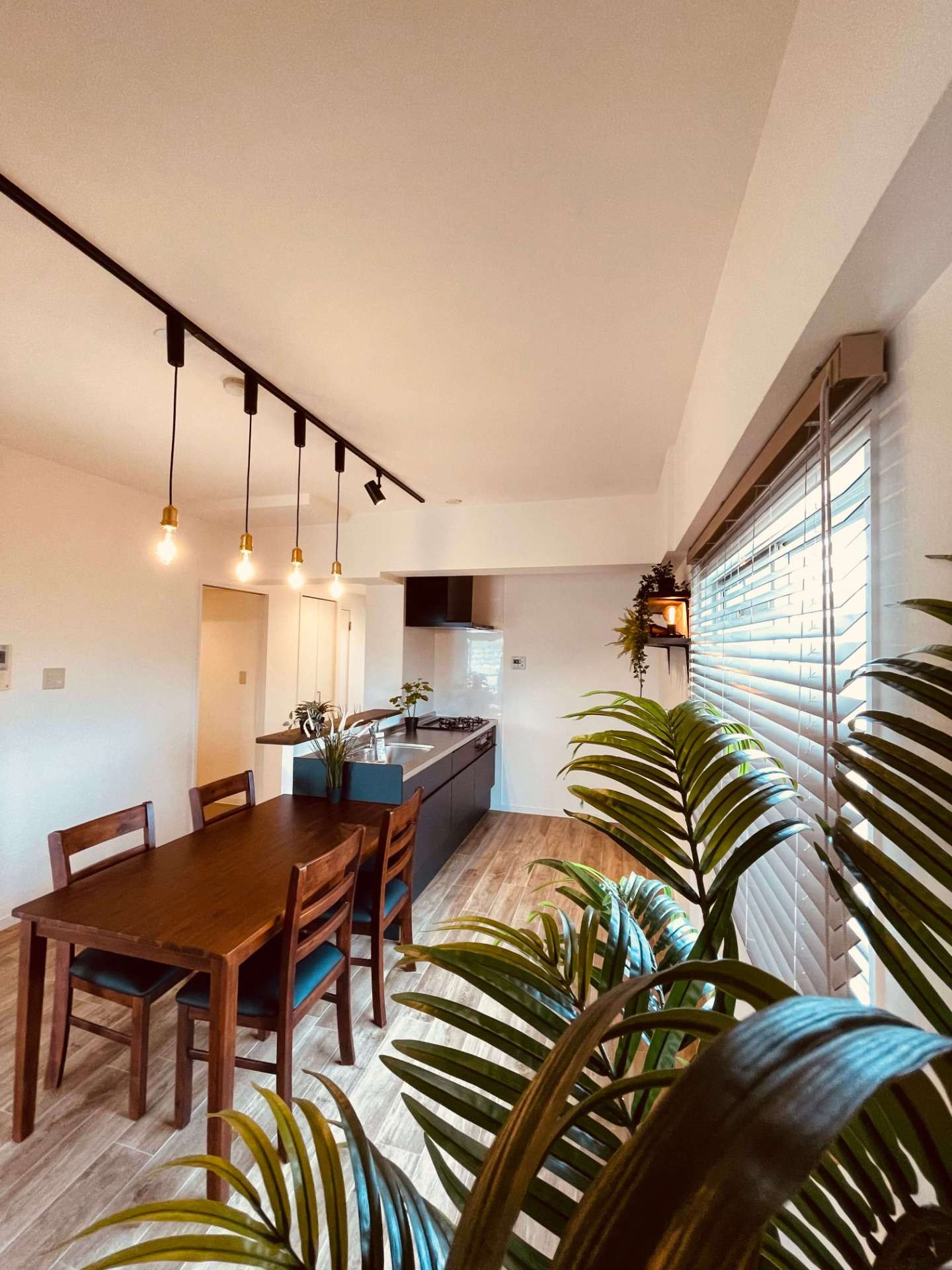 LDKは、落ち着いた木目調のフローリングと、アクセントとなるの木目調の壁紙が心地よい空間を創出。リビングのソファや観葉植物もグリーンで統一し、まるでカフェのような洗練された雰囲気に仕立てた。温かみのある照明やブラインドも、空間全体の雰囲気を高める重要な要素となっている。