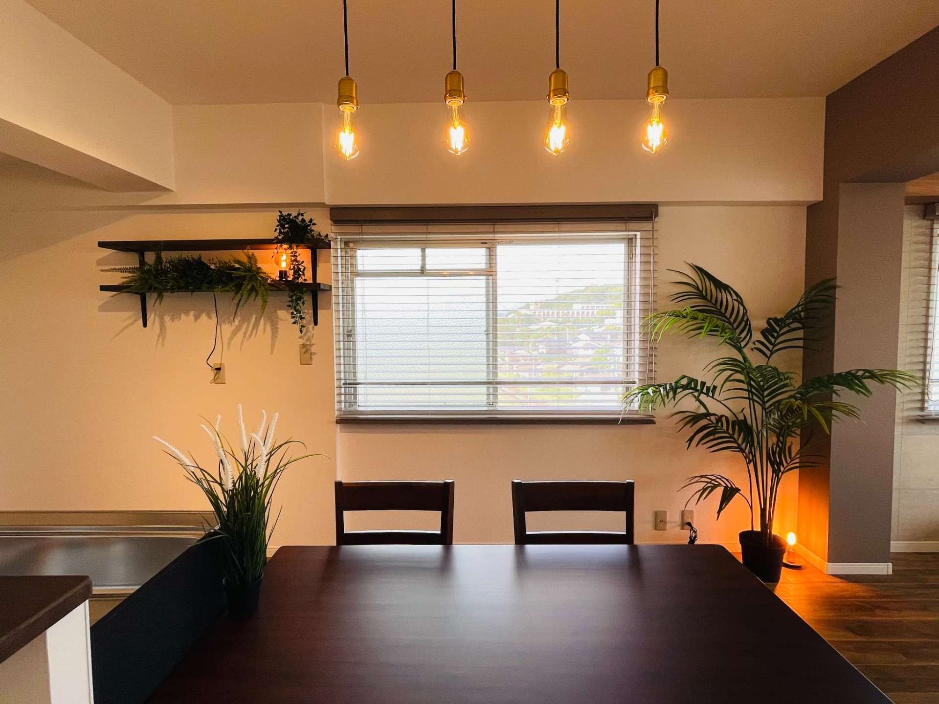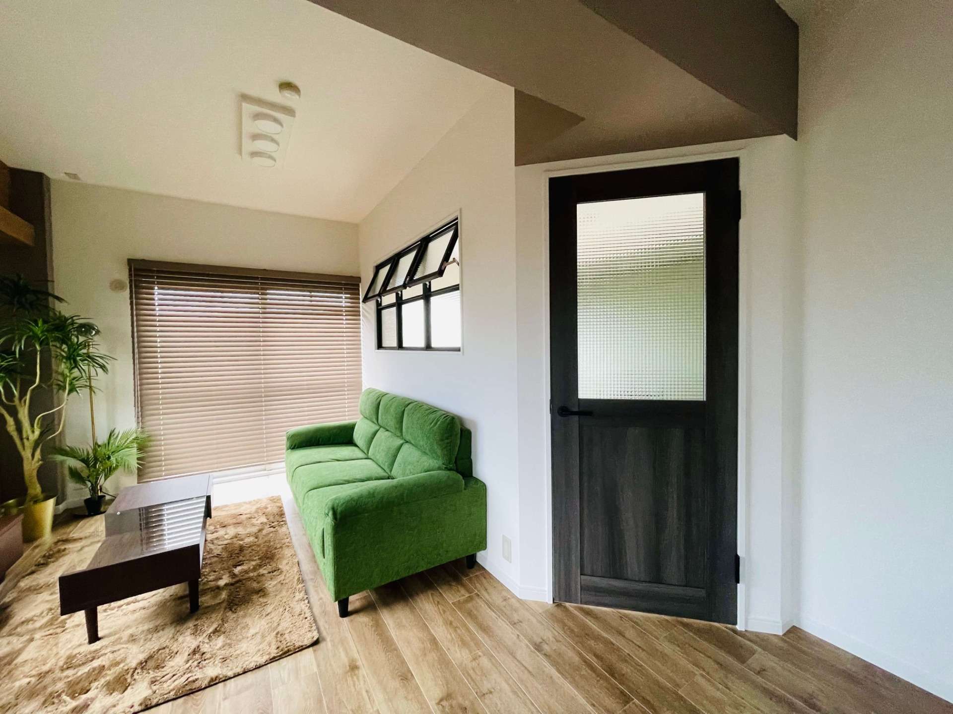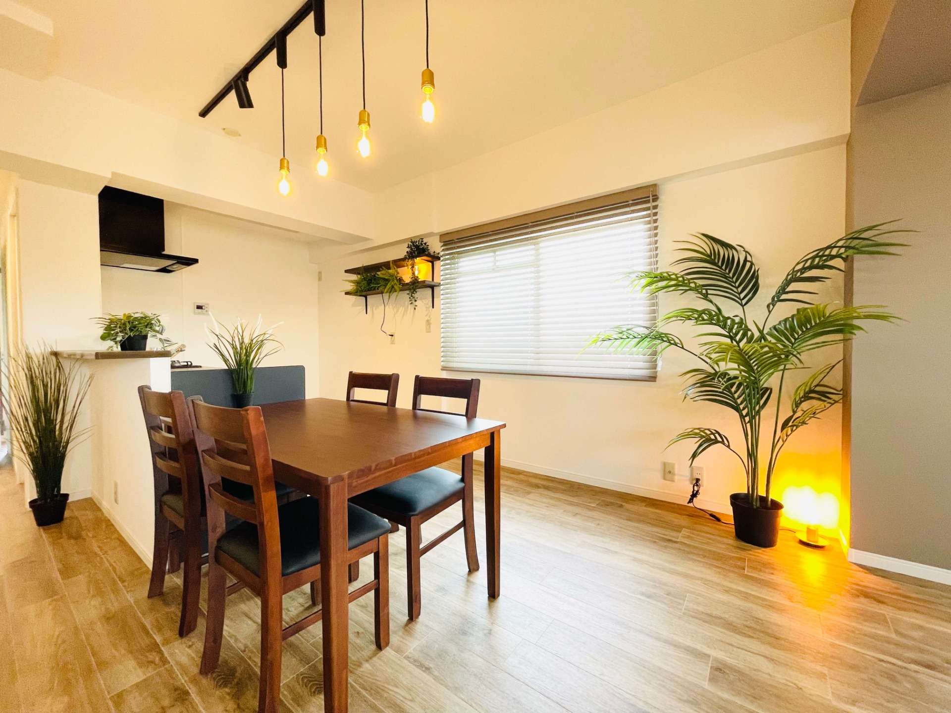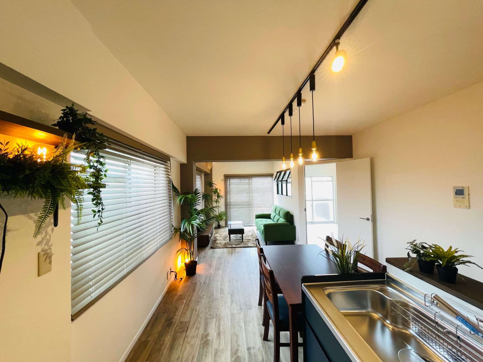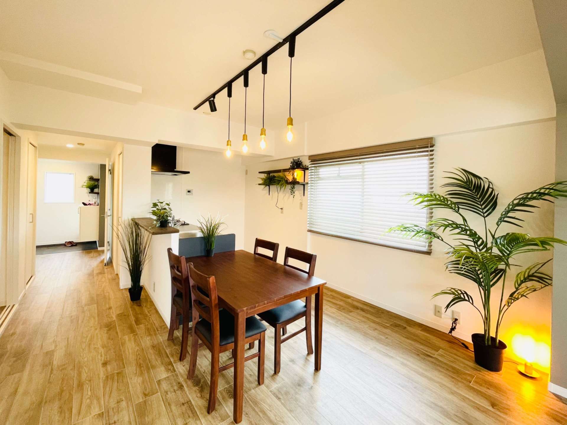 LDKは、落ち着いた木目調のフローリングと、アクセントとなるの木目調の壁紙が心地よい空間を創出。リビングのソファや観葉植物もグリーンで統一し、まるでカフェのような洗練された雰囲気に仕立てた。温かみのある照明やブラインドも、空間全体の雰囲気を高める重要な要素となっている。