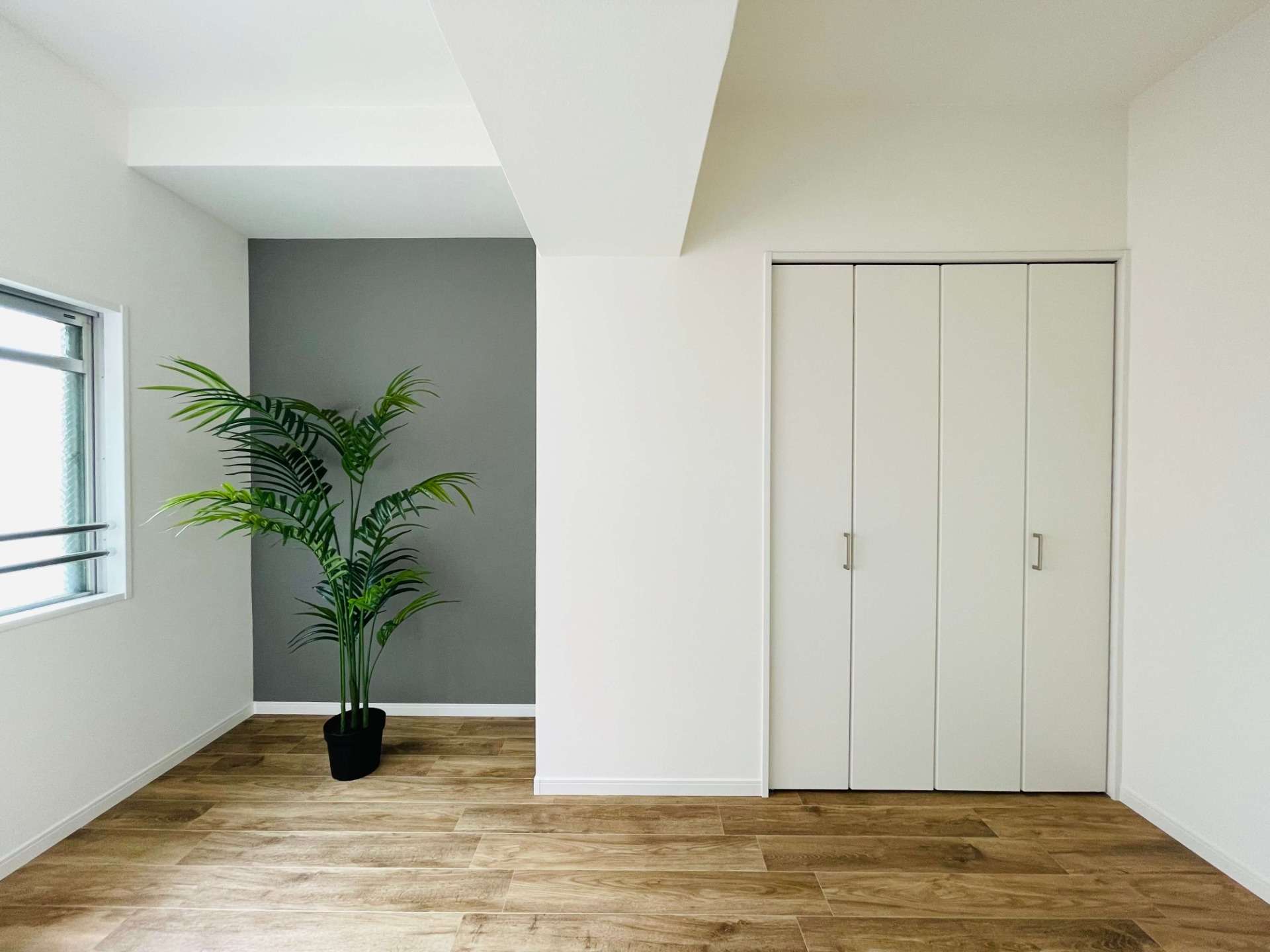 また、各部屋の扉やクローゼットの建具は、シックなダークカラーで統一。これにより、空間全体が引き締まり、スタイリッシュな印象を与えている。観葉植物や照明といったアイテムを効果的に配置することで、居心地の良い、癒しの空間が完成した。
