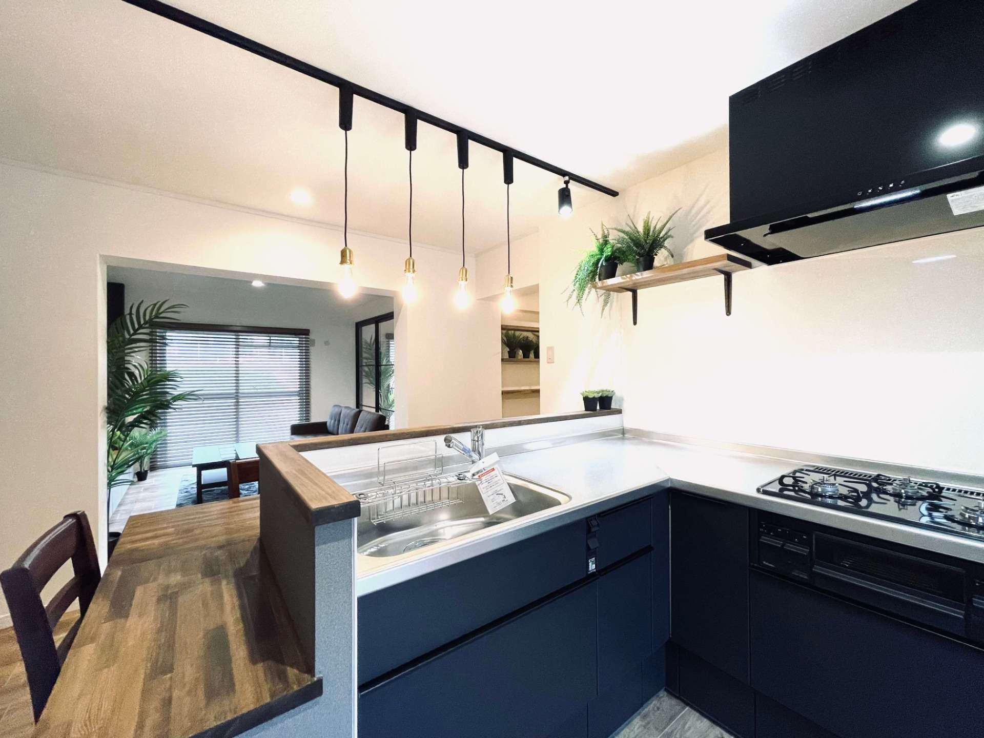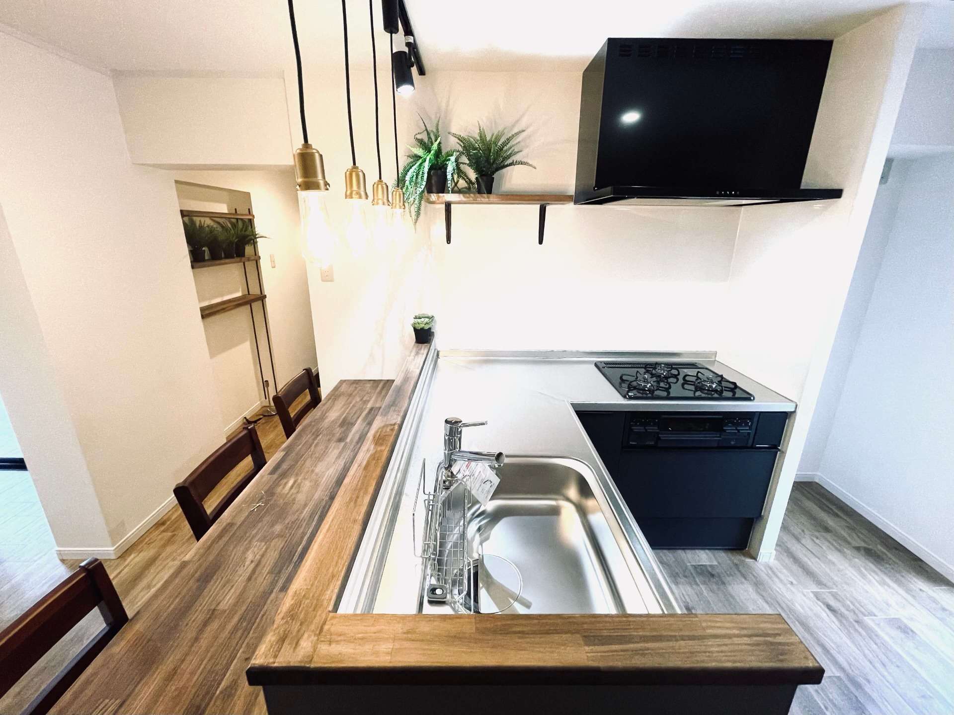 L型キッチンとカウンターがある家