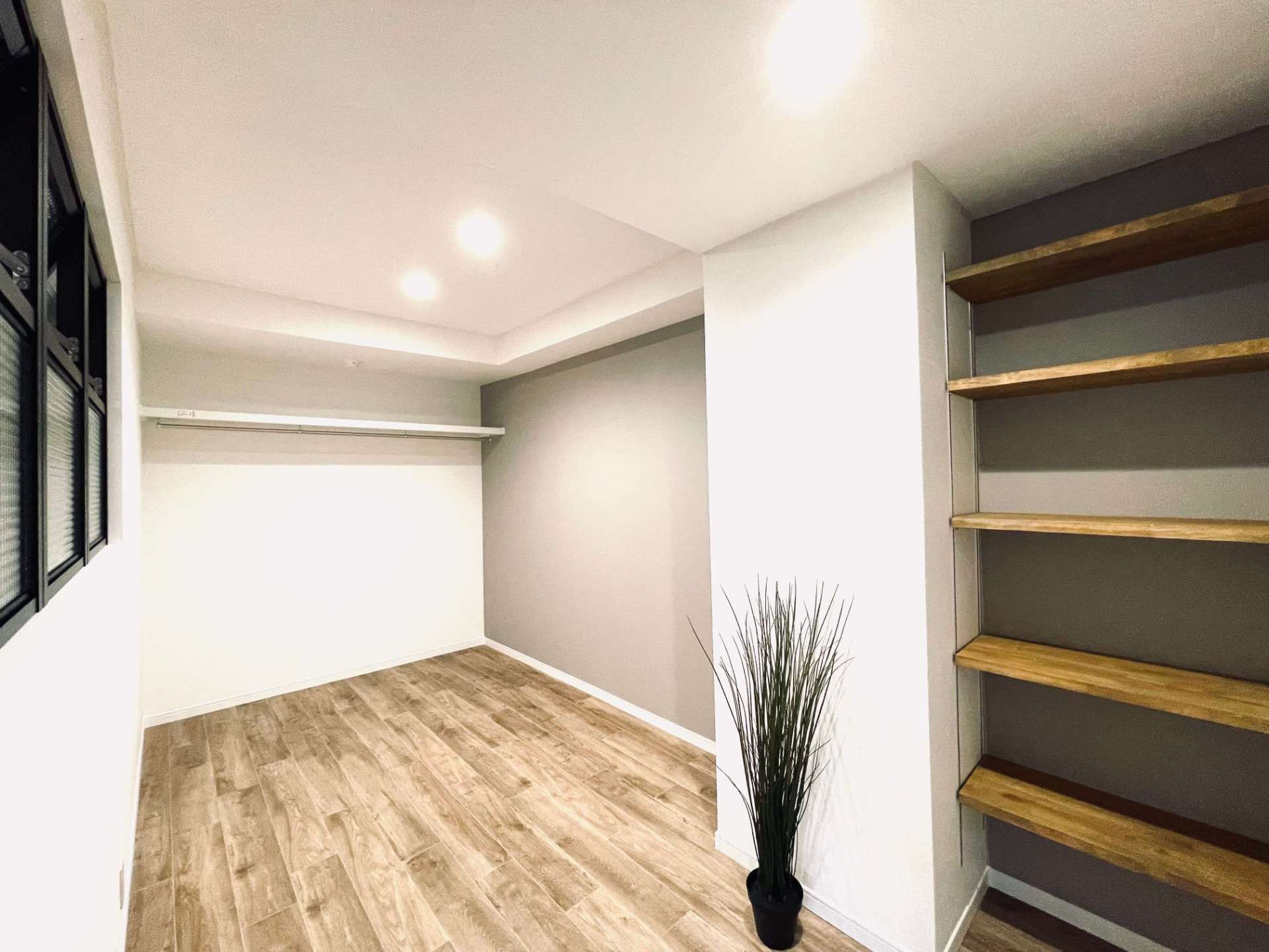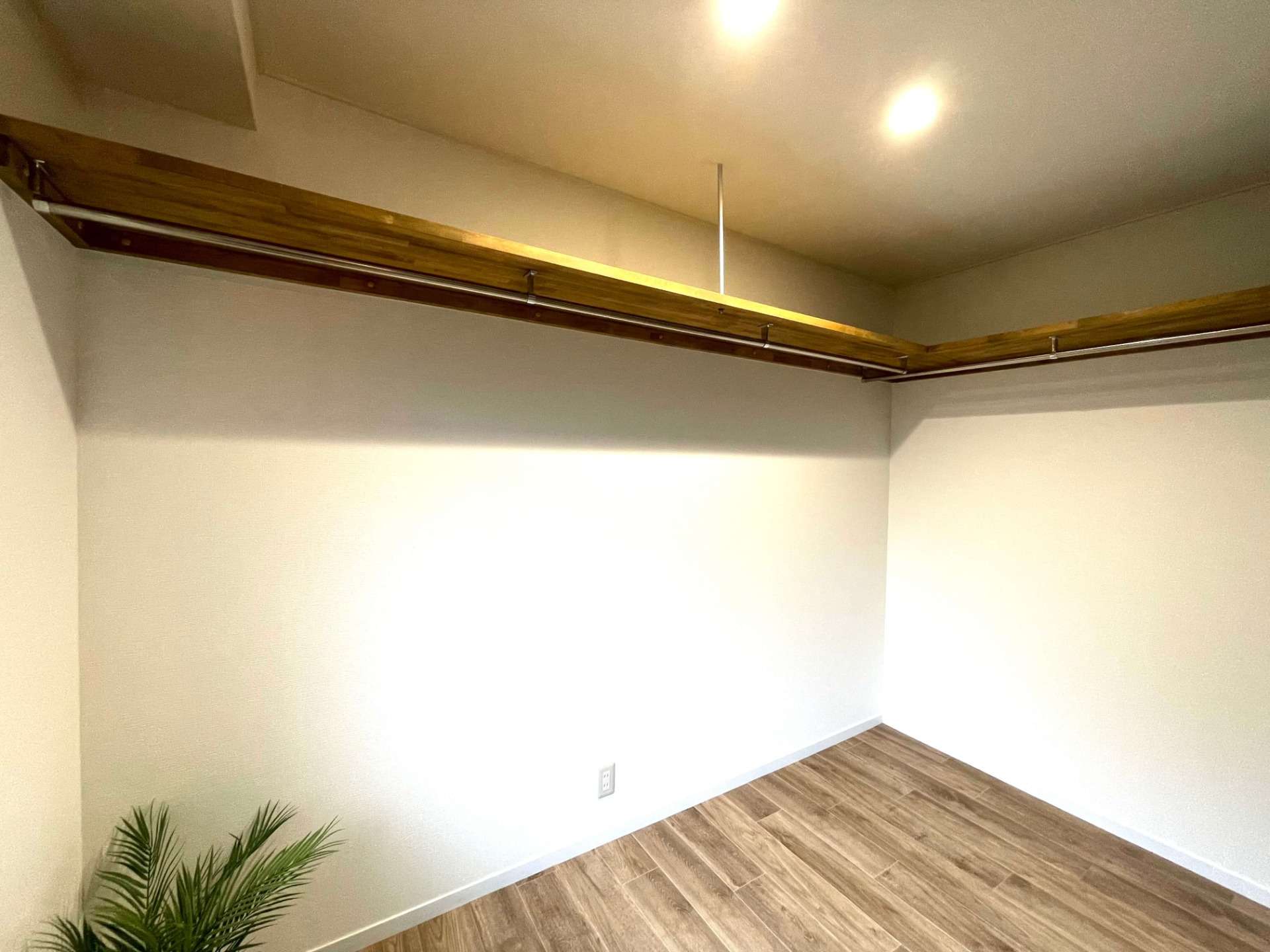 ウォークインクローゼットのハンガーパイプは一般的な取付高さにはせず、あえて高い位置に取り付けることで家具を配置すれば部屋としても使えるような設計に。