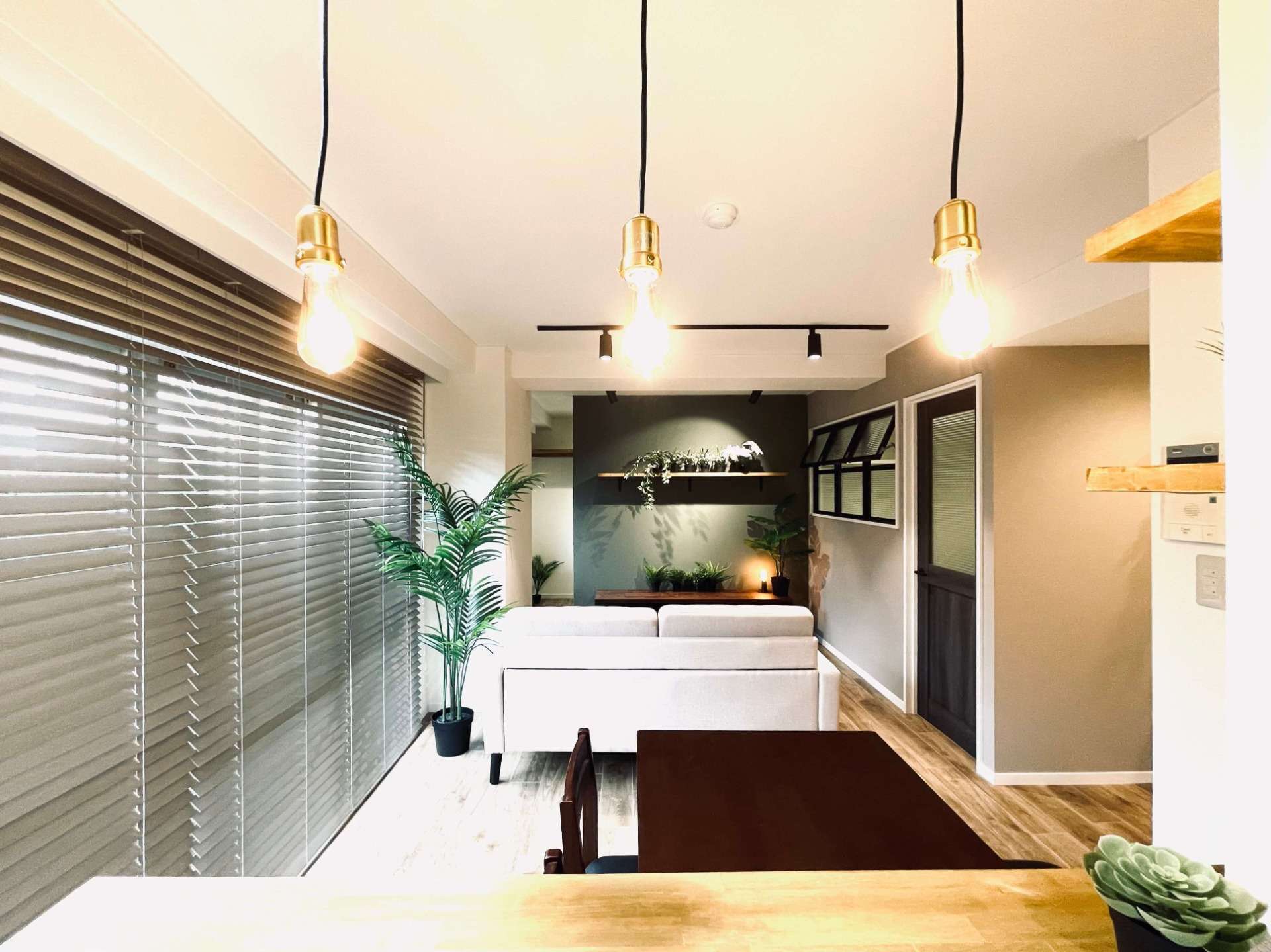 寝室には窓がなく暗い印象になるのを避けるため、室内窓や建具でLDK側からの光を取り入れることで解消。ガラスにはチェック模様のモザイクガラスを使用している為、プライベートな空間も確保しつつ、眩しさを感じない程度の自然光が差すようになりました。