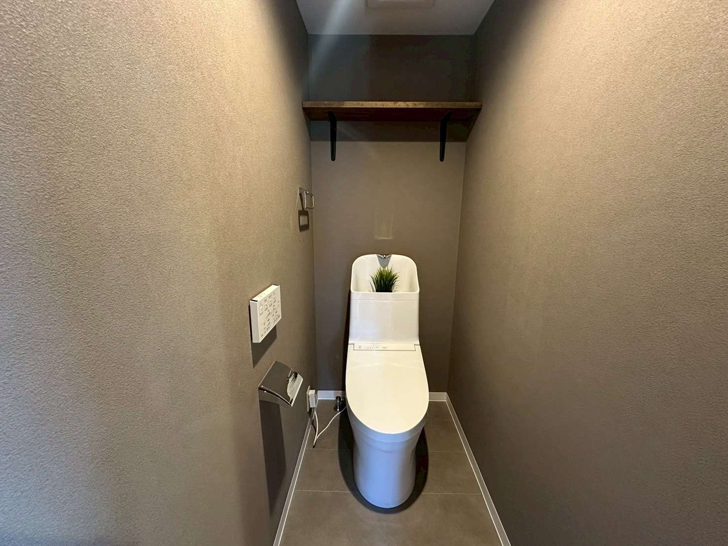 トイレの床にはラメの入ったクッションフロアを採用し、シックで清潔感のある空間に。造作棚もついているのでこまごまとしたトイレ用品も収めることができる。