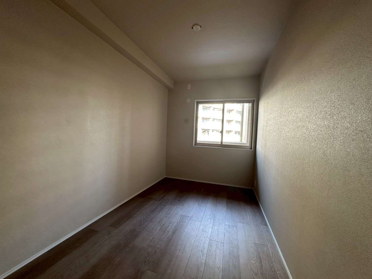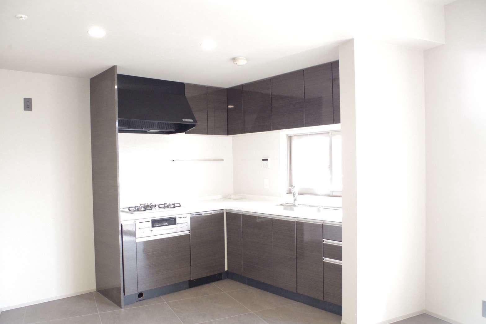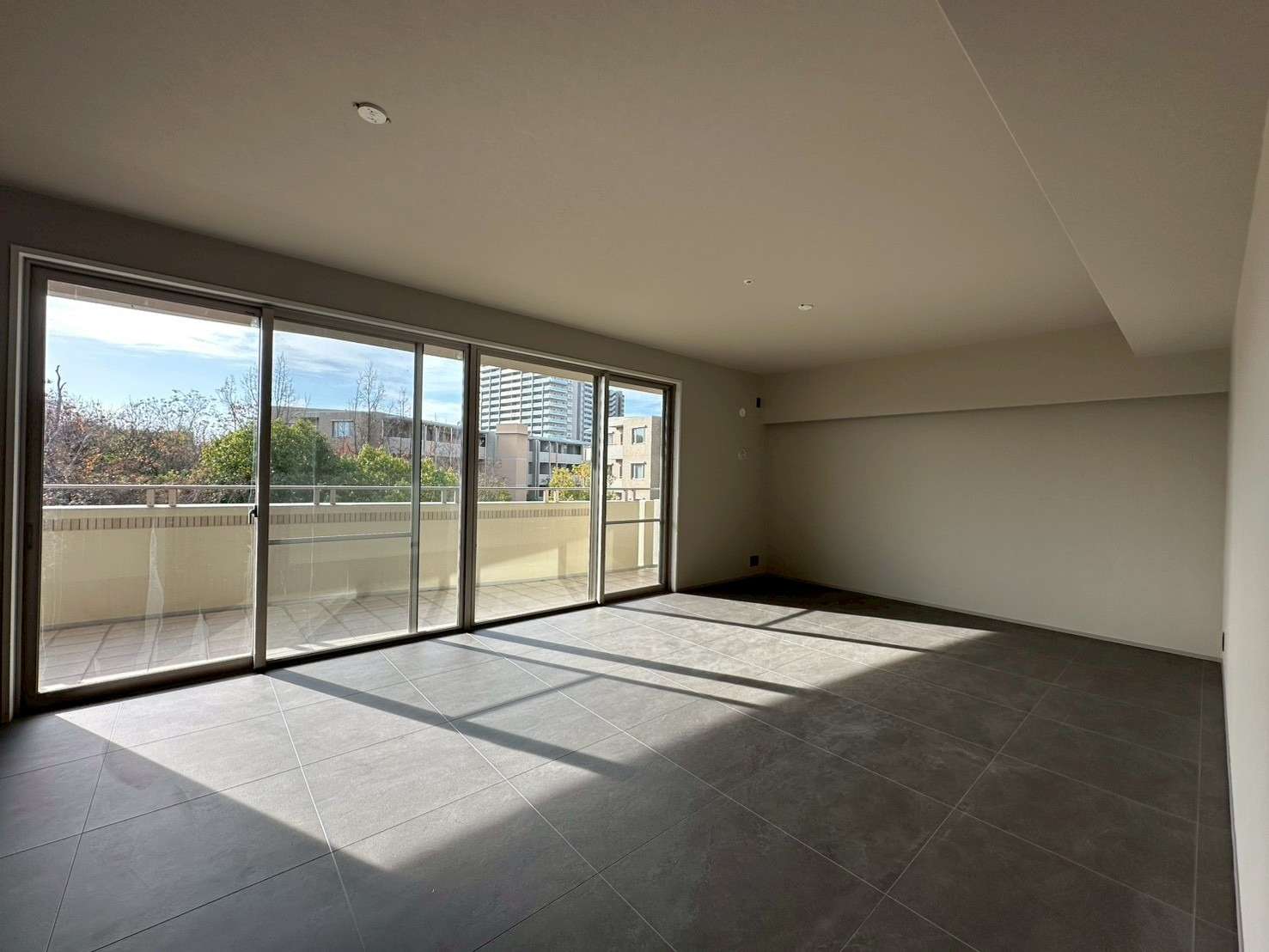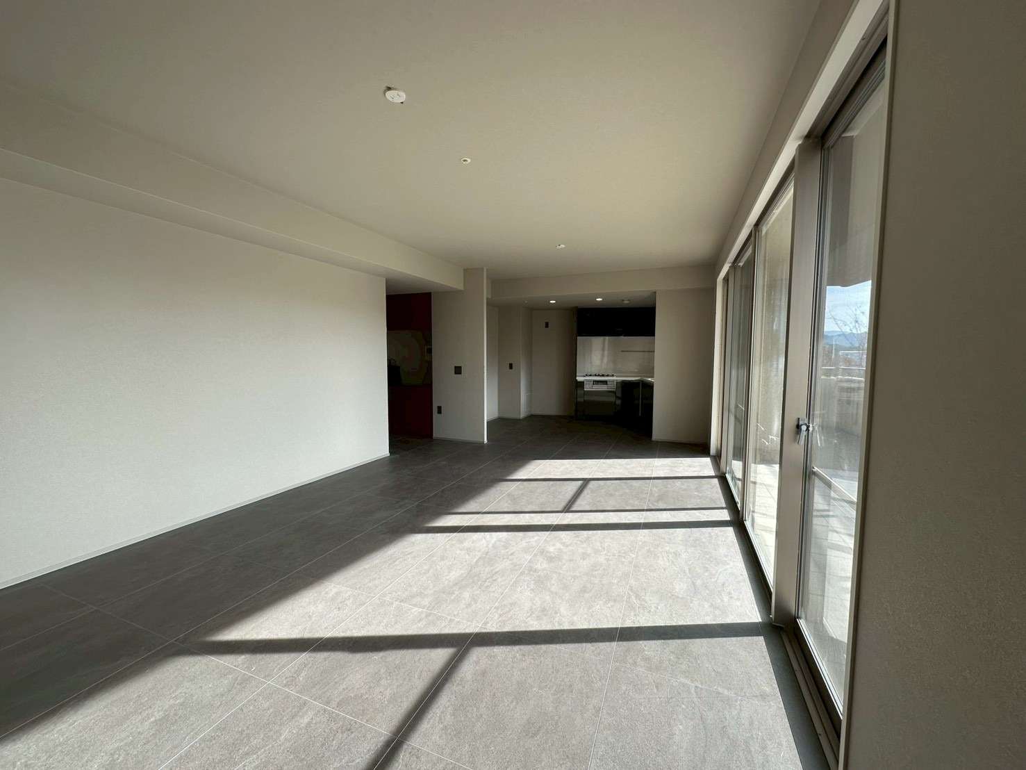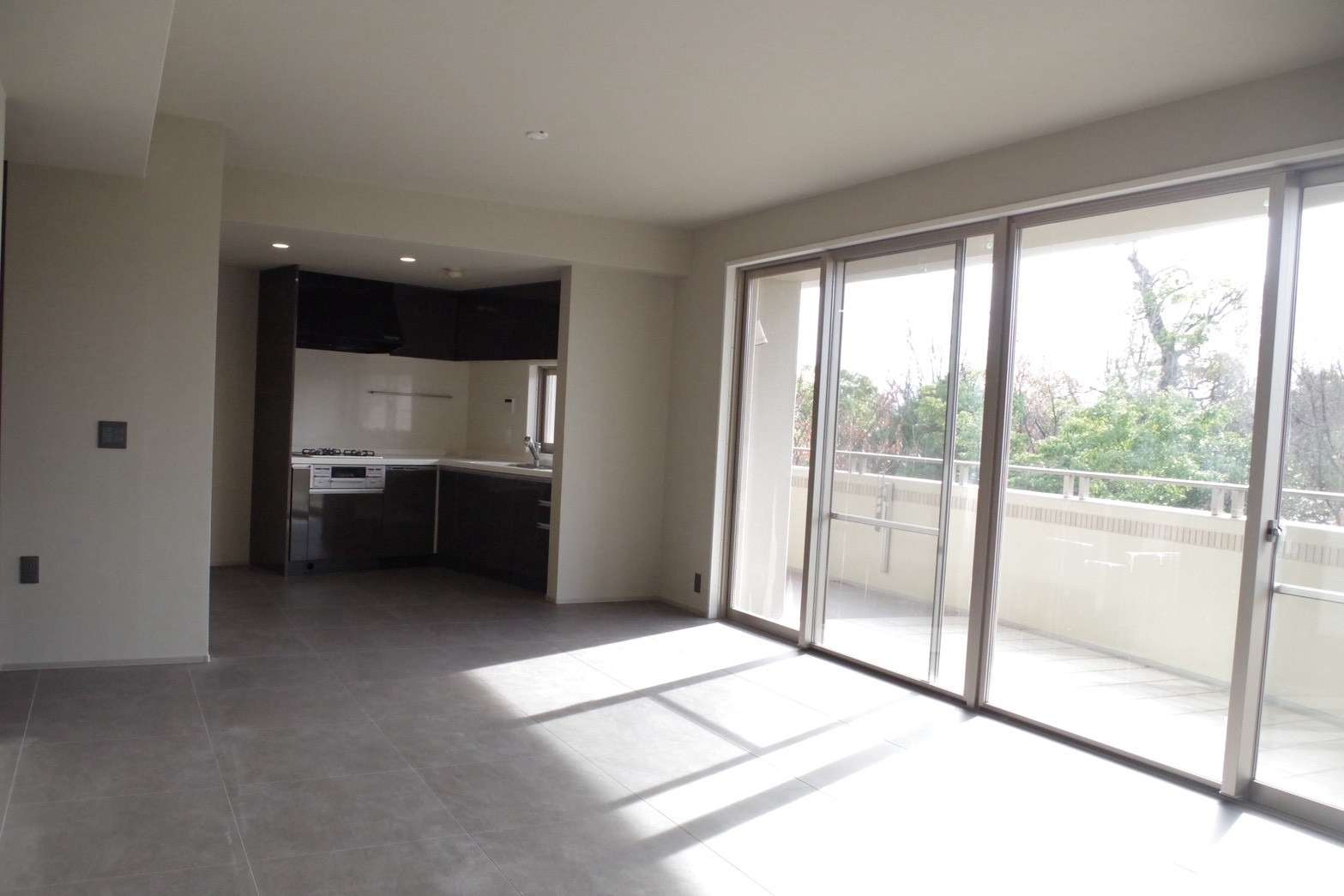リビング・ダイニング: 大型の窓から豊かな採光を取り込み、グレーのタイル調フロアとダークトーンのシステムキッチンが組み合わせることで、洗練されたモダンな空間を実現しました。広々としたバルコニーと相まって、開放感あふれる住まいとなっています。