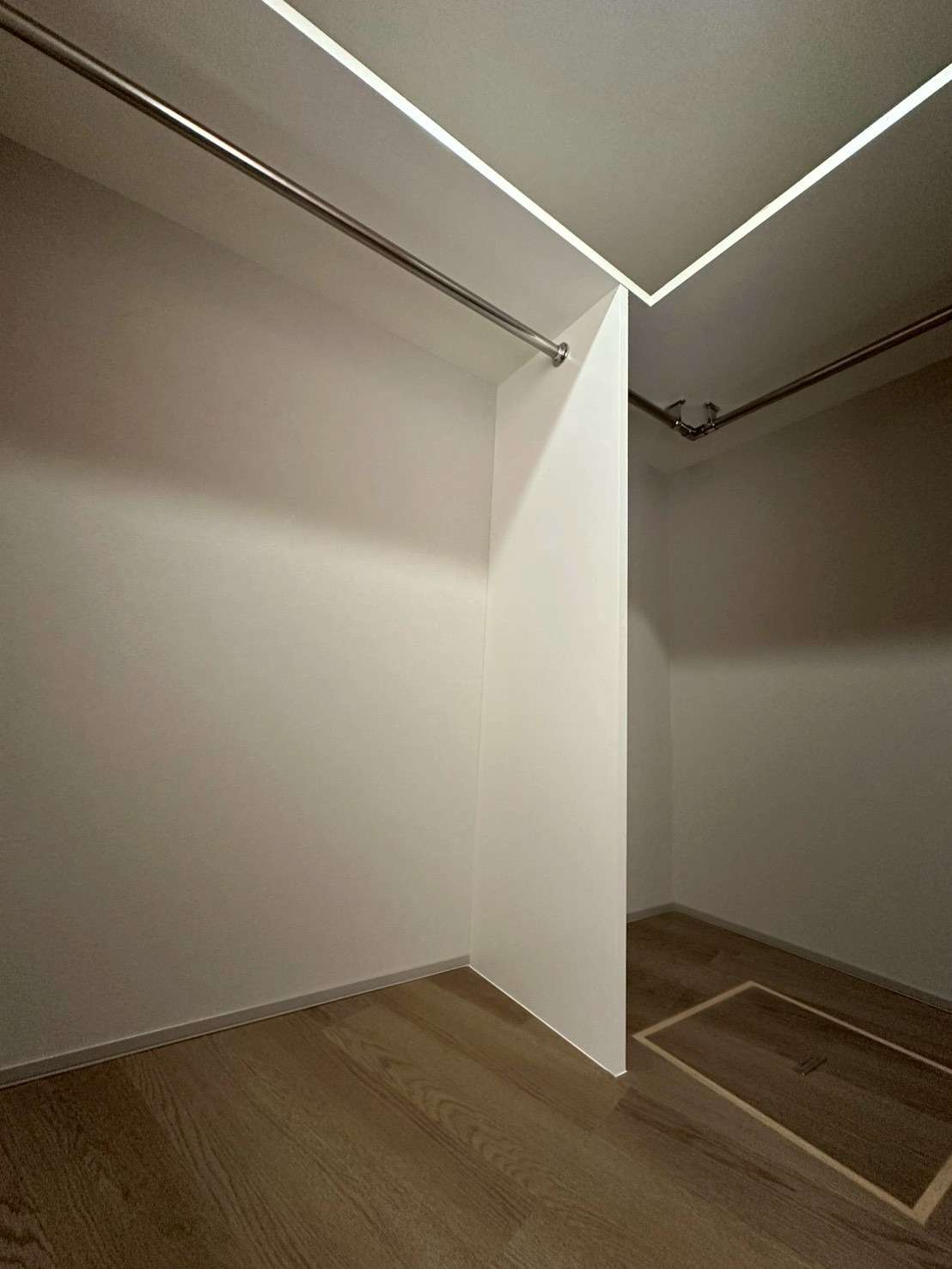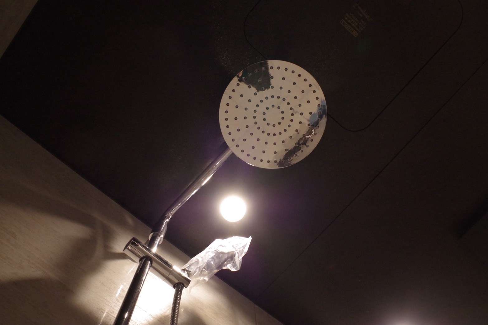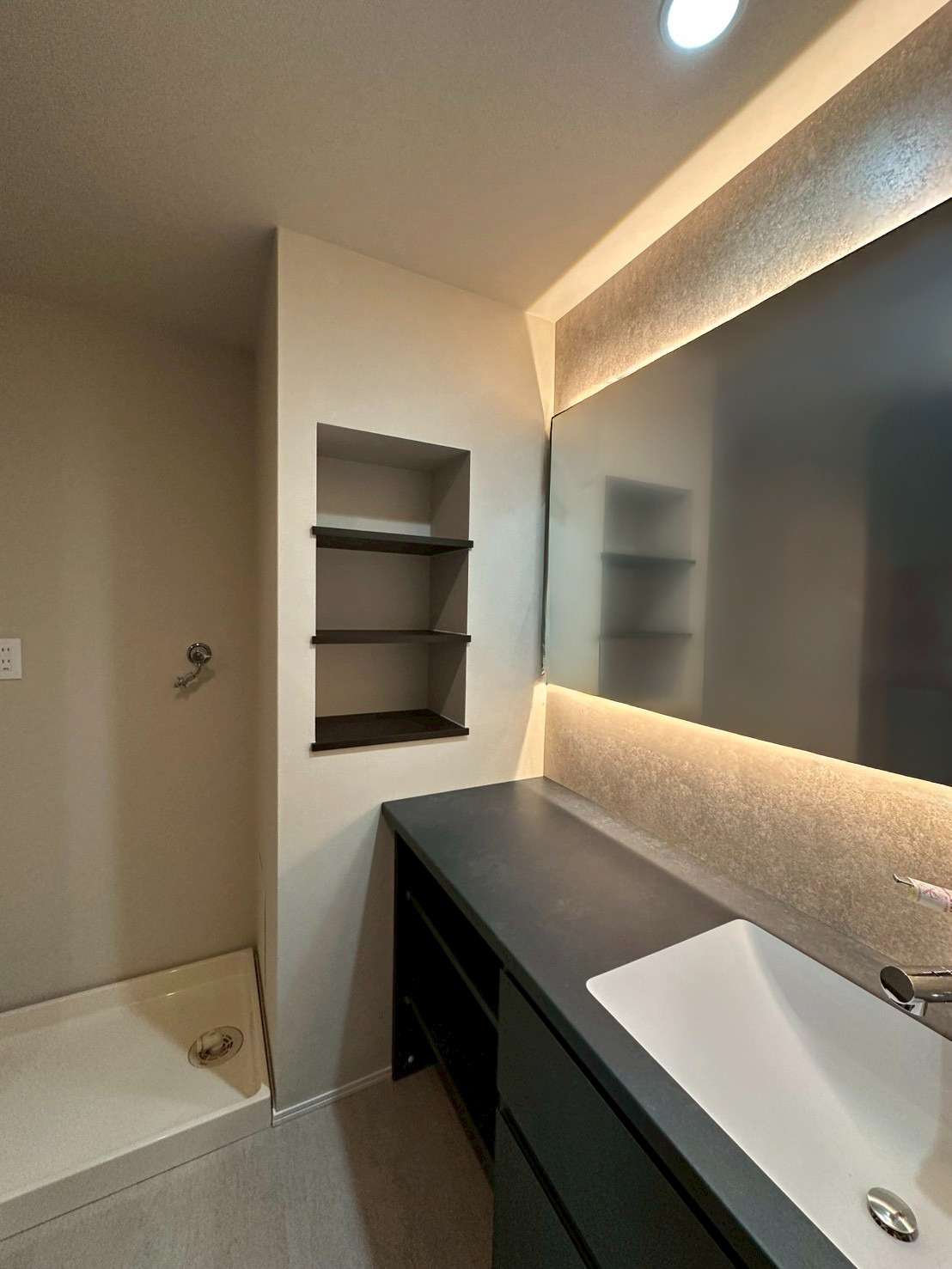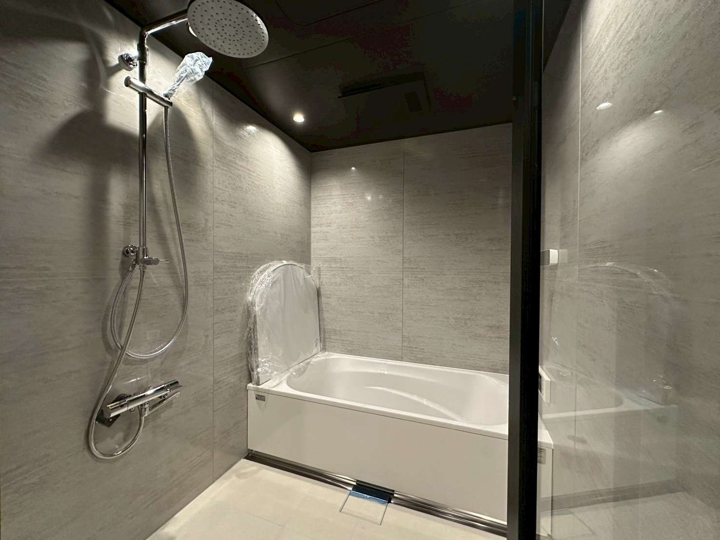 サニタリー: 洗面化粧台やバスルームには、落ち着いた色味のタイルや木目調の収納を採用。特にバスルームは、天井から降り注ぐオーバーヘッドシャワーや、間接照明を効果的に配し、高級ホテルのようなリラックスできる上質な空間に仕上げました。