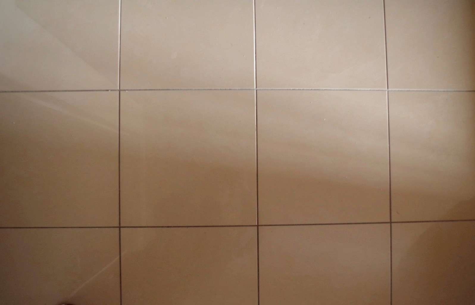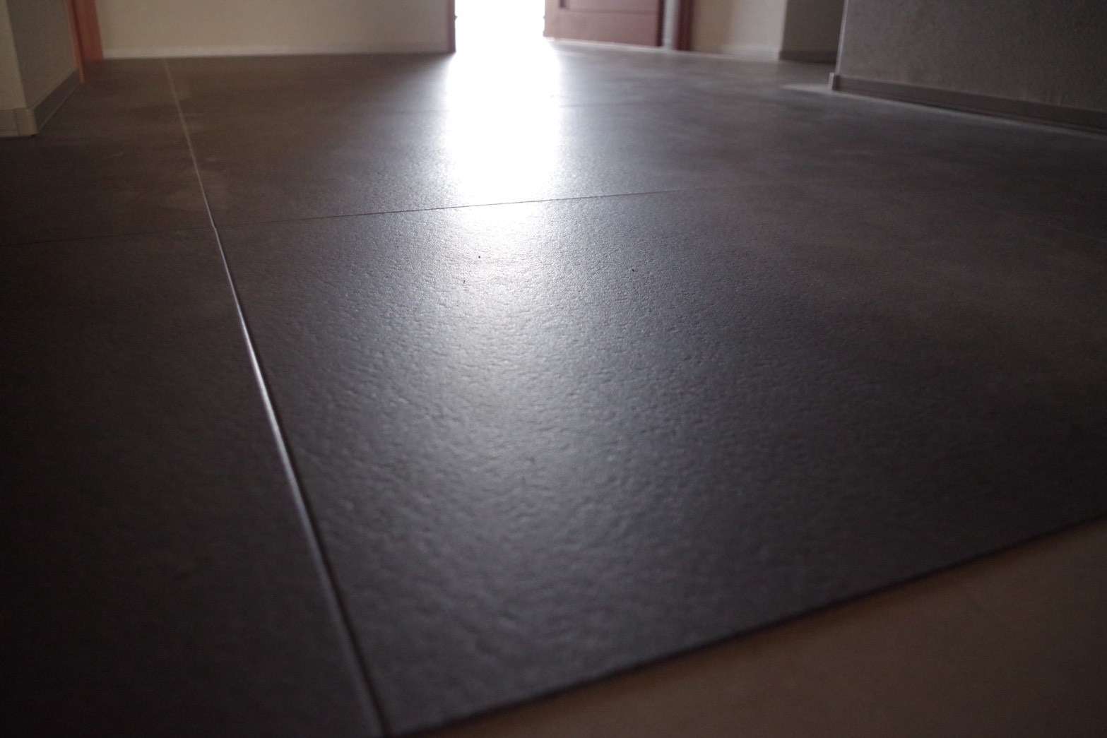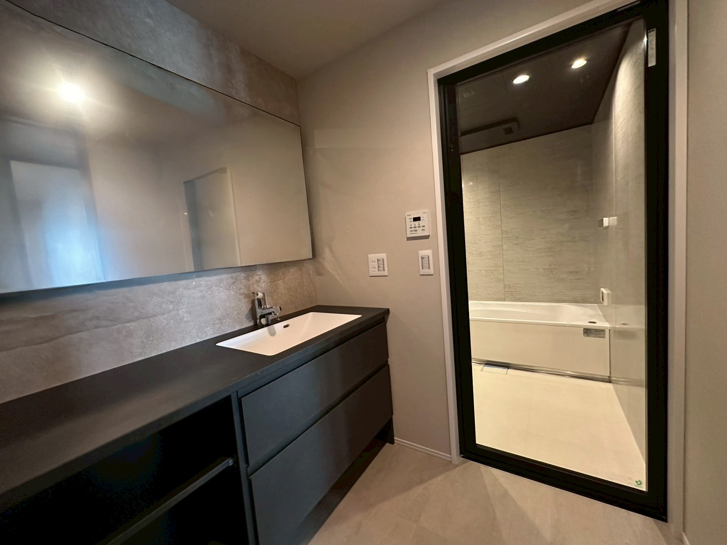 全体の色調: 統一されたダークグレーのフロアタイルは、一辺が600mmのビッグサイズを使用することでラグジュアリーな雰囲気に。汚れが目立ちにくく、お手入れも容易。壁面をエクルベージュカラーでまとめることで、コントラストの効いたモダンな仕上がりとなっています。