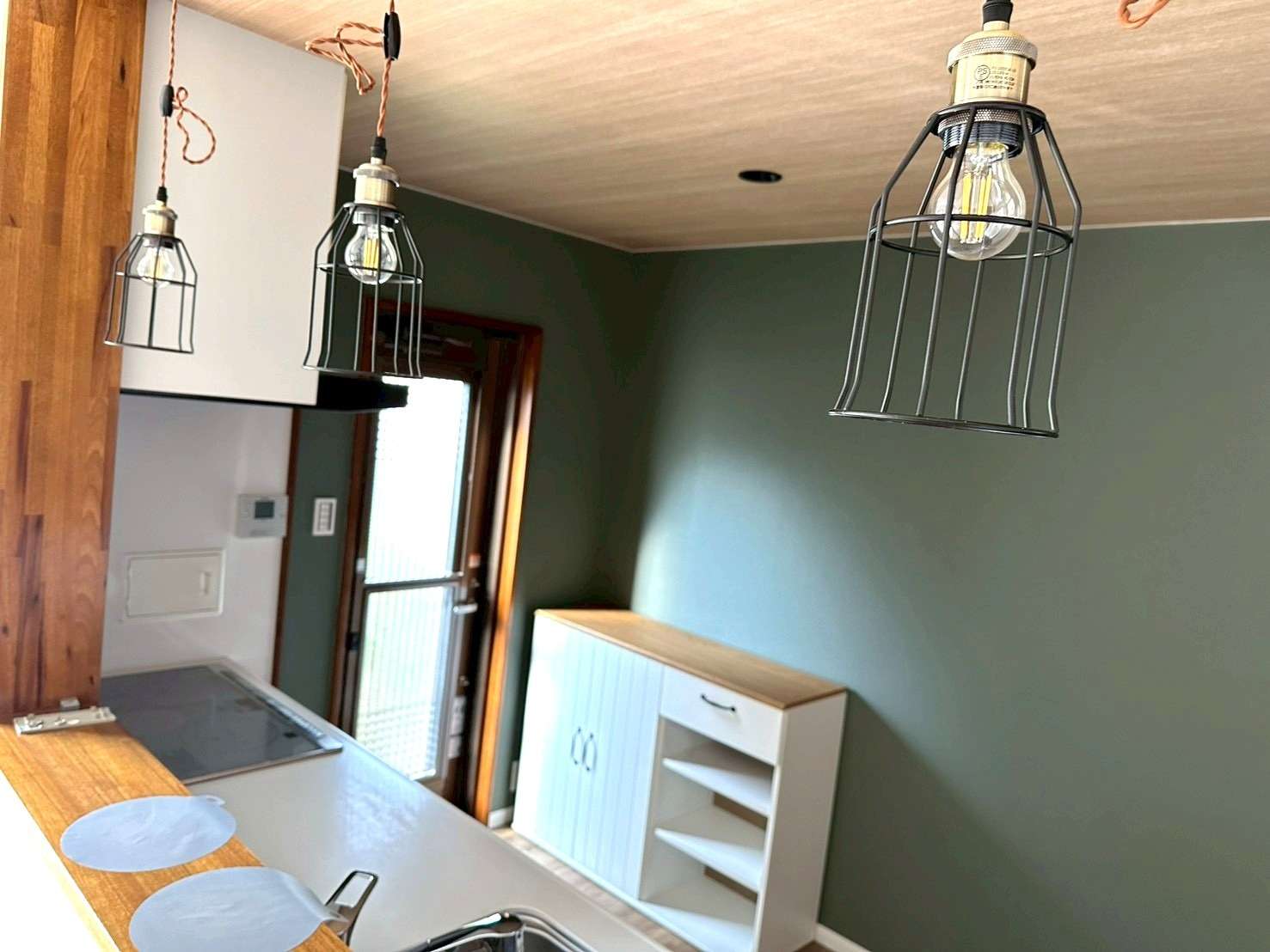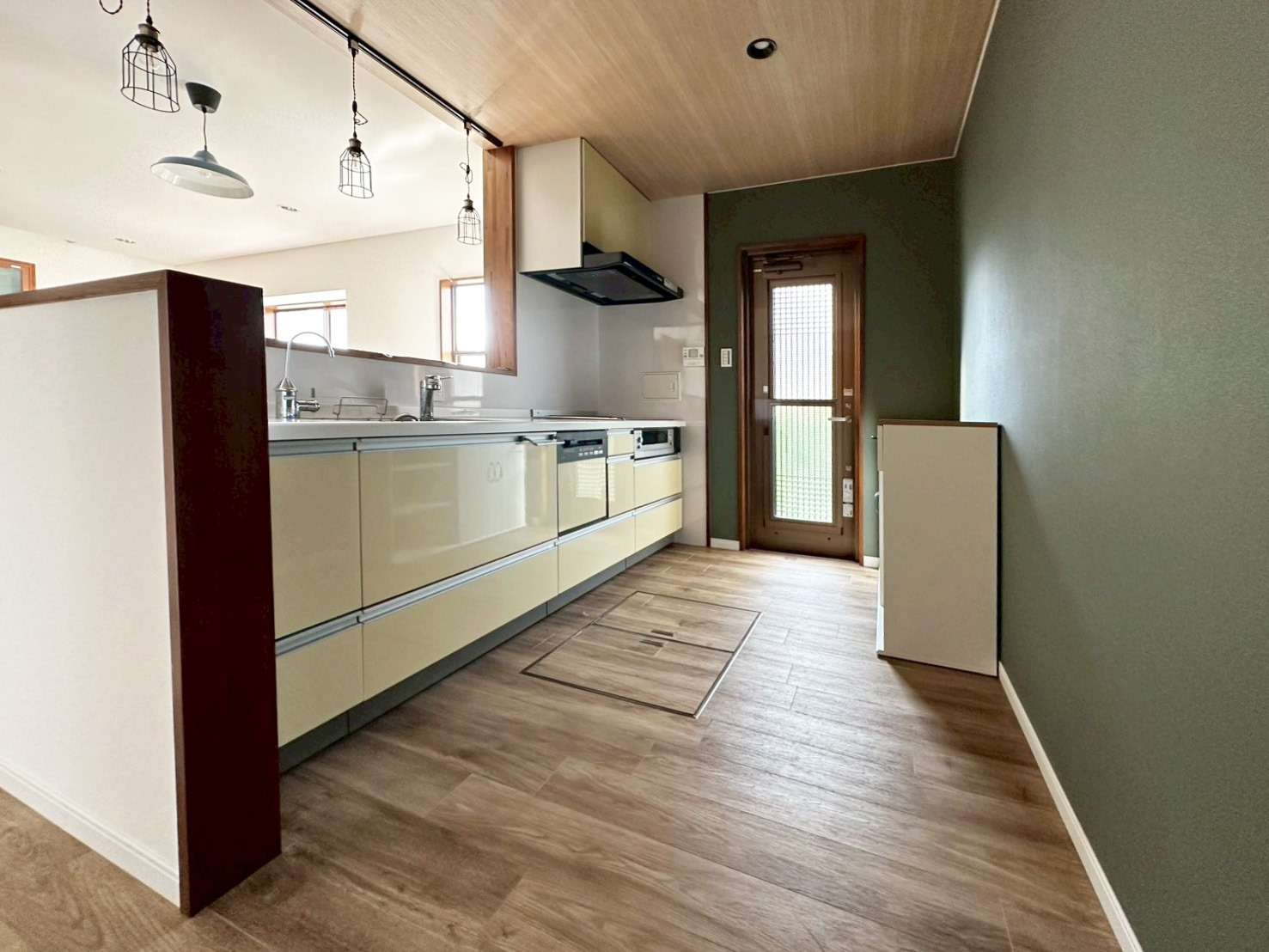 LDK: 木目が美しい天井とグリーンの壁面が印象的なキッチン。カフェのようなライティングが、家族の団らんを優しく照らします。