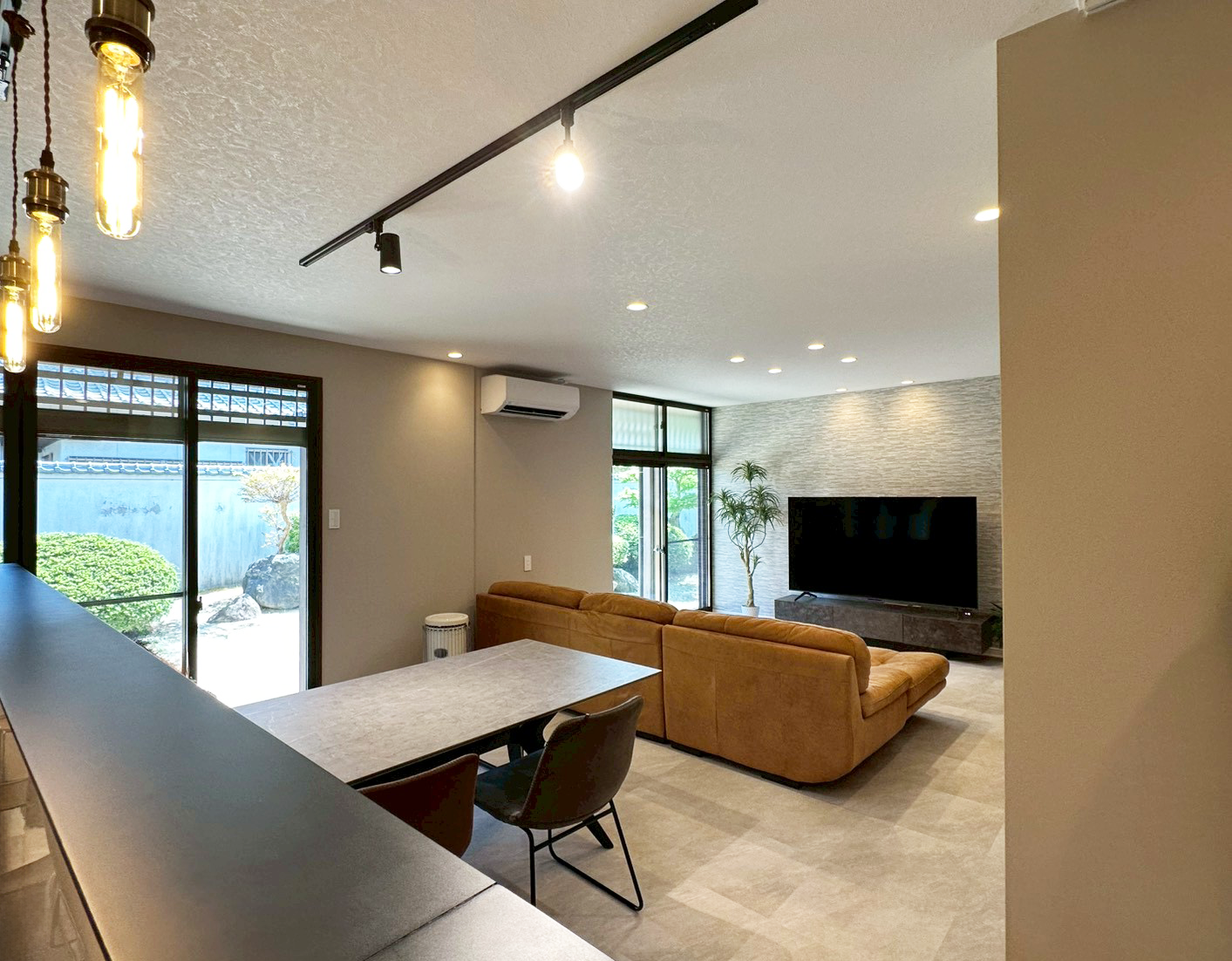 かつての細かく仕切られた和室を、光が通り抜ける広々としたLDKへ。 一番のこだわりは、お庭の緑をインテリアの一部として取り込む設計です。リビングに座れば、大きな窓越しに四季折々の景色が広がり、まるでおしゃれなカフェで寛いでいるような贅沢な時間が流れます。