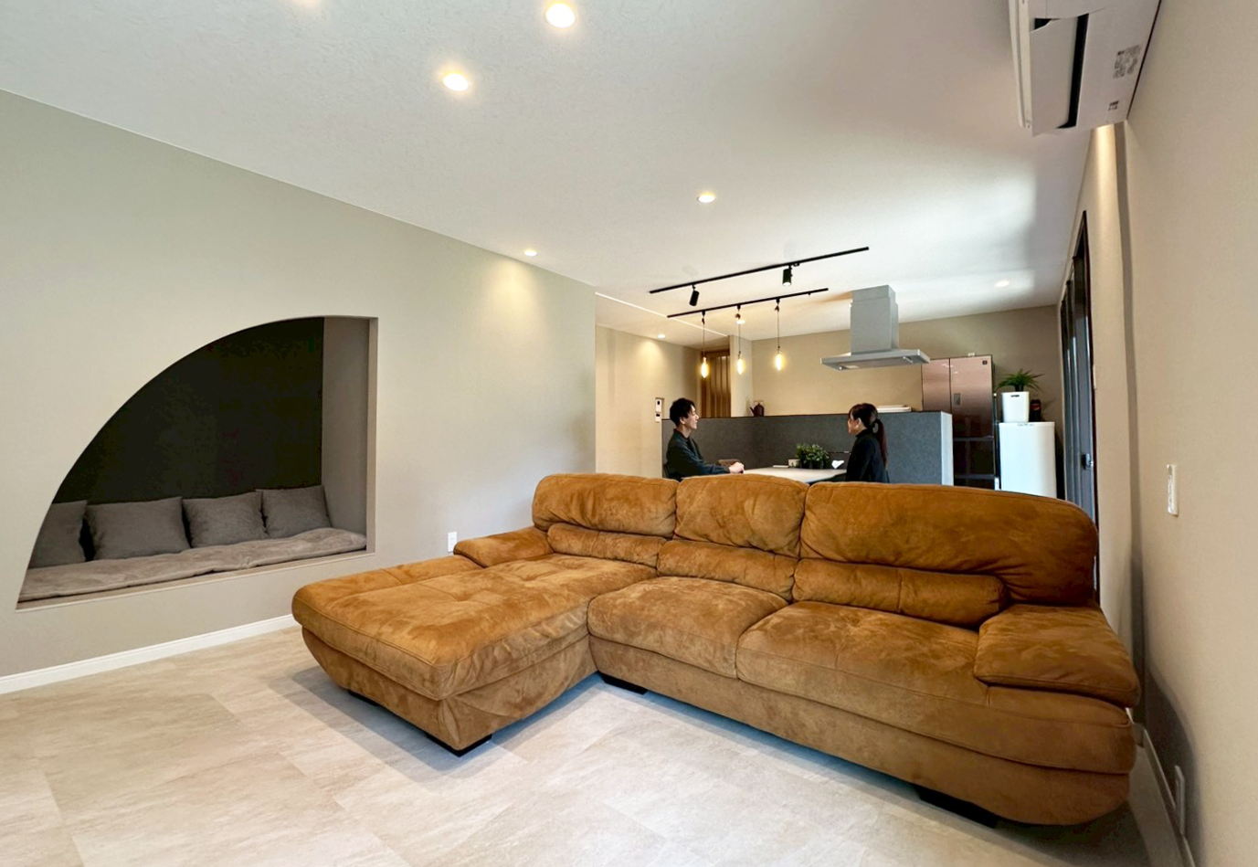 今回、特にお客様に喜んでいただけたのが、リビングの一角に設けたアーチ型の「ヌック」です。 ちょっとお籠もり感のあるこのスペースは、読書をしたり、お子様と遊んだり、家族の気配を感じながらも一人の時間を楽しめる特等席。